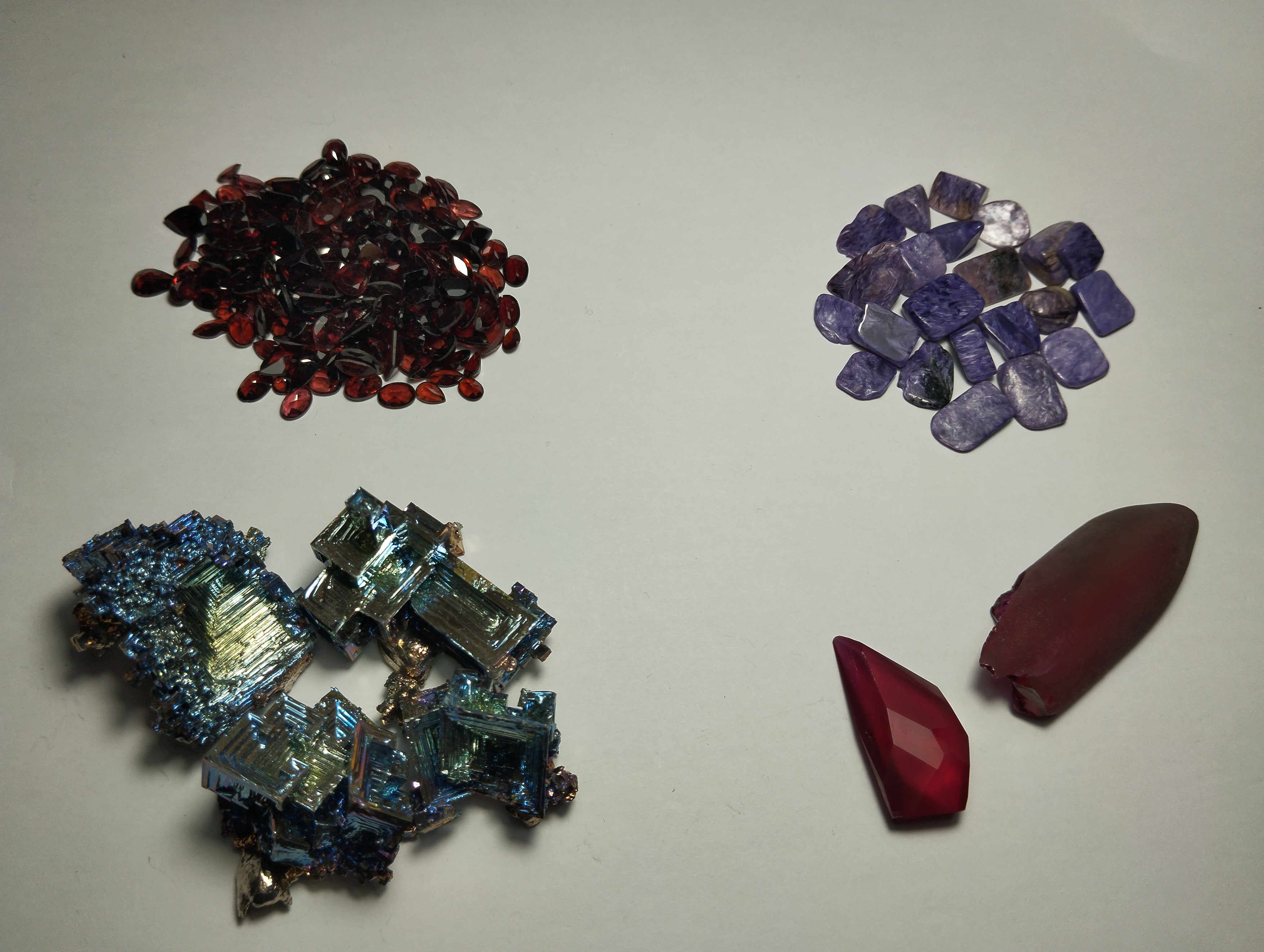 | Les pierres « Gemmes » sont des pierres formées dans des gîtes naturels (Décret n°2002-65 du 14 janvier 2002 relatif au commerce des pierres gemmes et des perles). Mais pour désigner une pierre transparente et de bonne qualité, vous risquez d’entendre qu’une pierre est de « Qualité Gemme ». (Par exemple les pierres sur la photo en haut à gauche sont des Grenats de Qualité Gemme) | Les Pierres « Ornementales ou Décoratives » sont des pierres gemmes généralement massives, opaques ou ayant de la translucidité. (En haut à droite vous avez de la Charoïte qui fait partie des pierres Ornementales et Décoratives) |